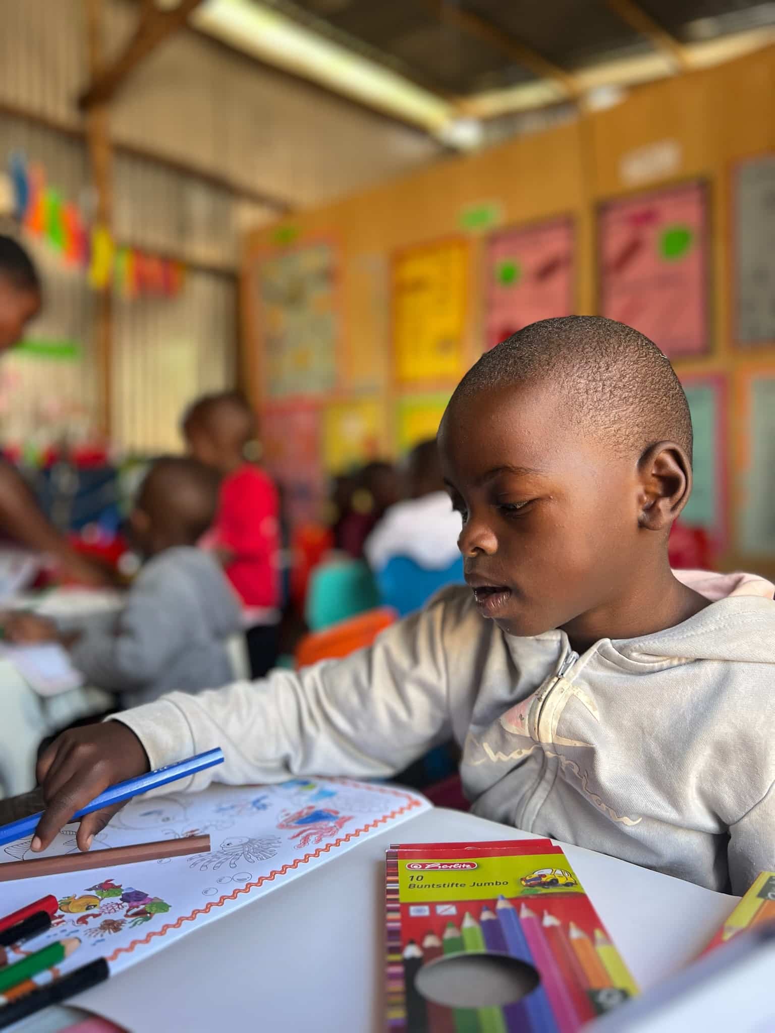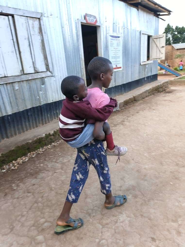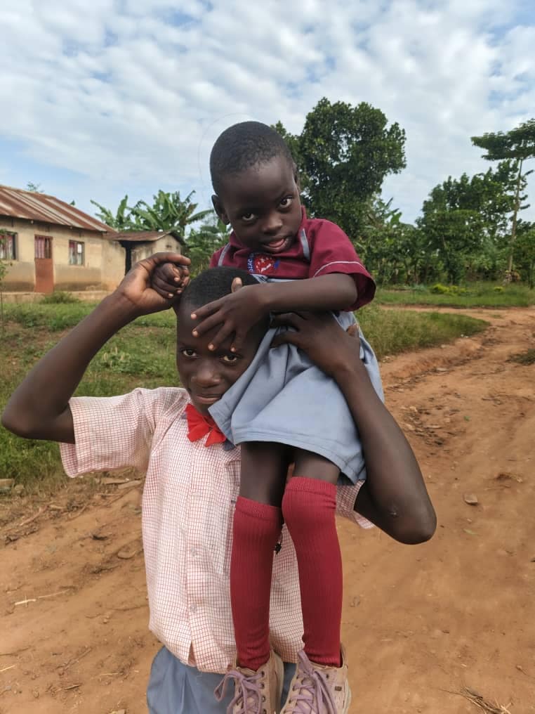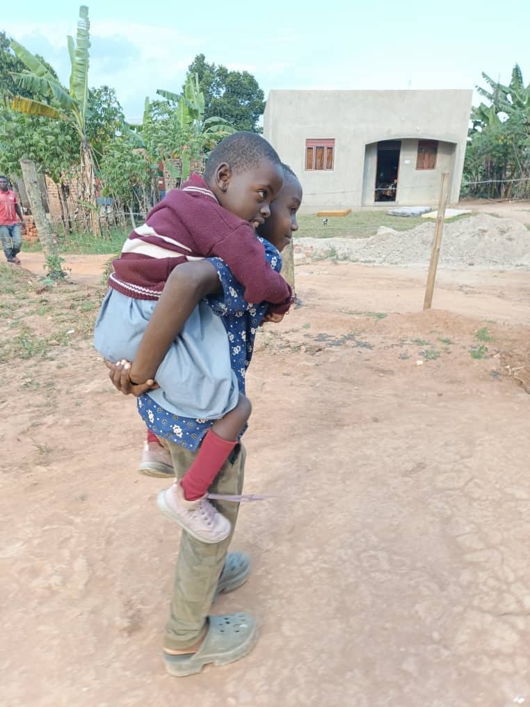 Hope Nakato ist sechs Jahre alt und lebt seit ihrer Geburt mit einer Zerebralparese. Sie kann nicht laufen, ist aber kognitiv fit, spricht und schreibt – mit großem Willen und einem Lächeln, das uns sofort berührte. In Uganda ist es außergewöhnlich, dass ein Kind mit Behinderung überhaupt zur Schule gehen darf. Gloria hat ihr diesen Platz ermöglicht.