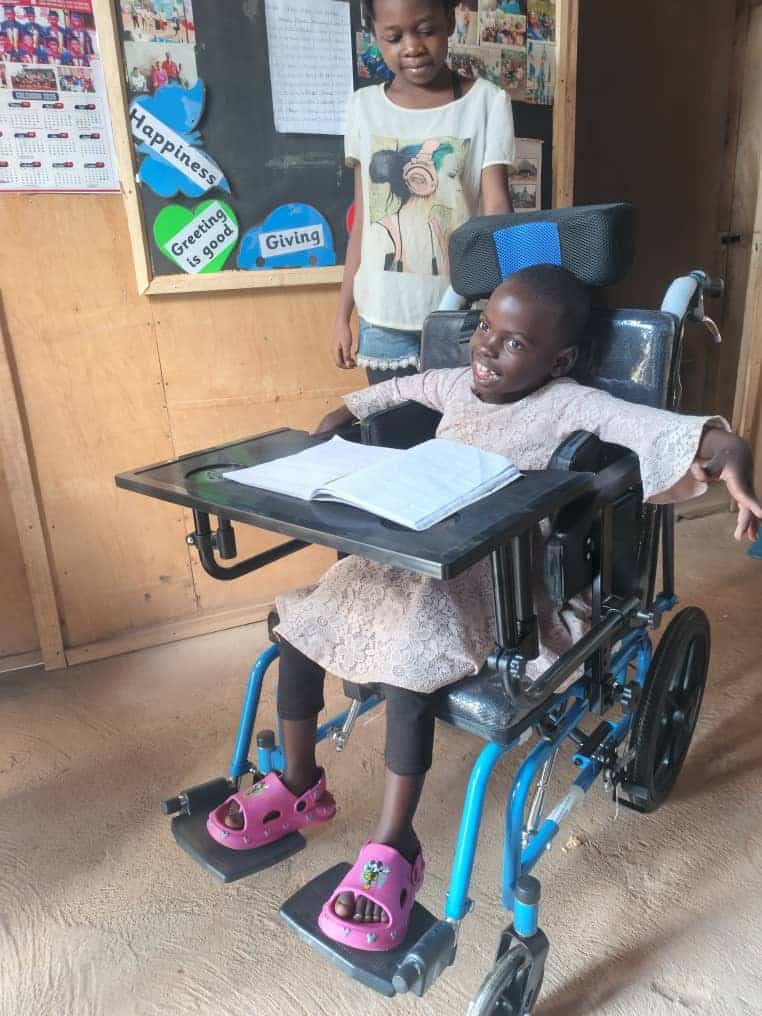 Beim Betriebsfest der Niederlassung Karlsruhe sammelten wir Spenden und konnten einen Rollstuhl mit Kopfstütze und Tisch finanzieren. Damit ist Hope nun viel mobiler, kann im Unterricht besser teilnehmen und aktiver lernen.